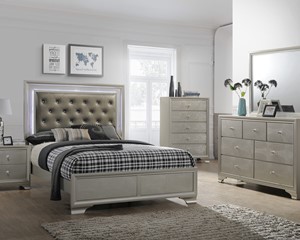 Bedroom Group with LED lights Dimensions: Dresser - 58.4 x 16.4 x 37.4H Mirror - 45.5 x 0.8 x 35.4H Nightstand - 23.6 x 16.4 x 24.3H Chest -... more info